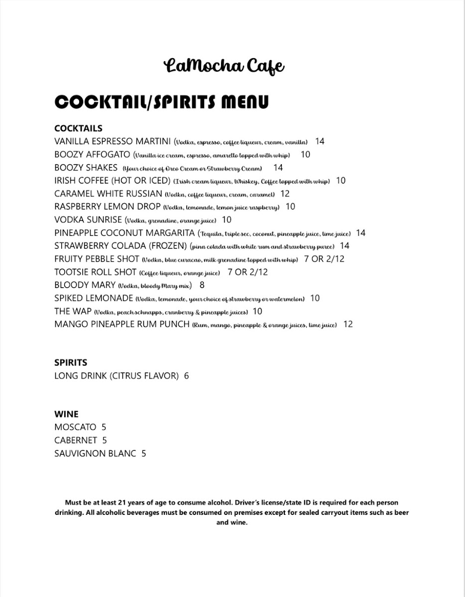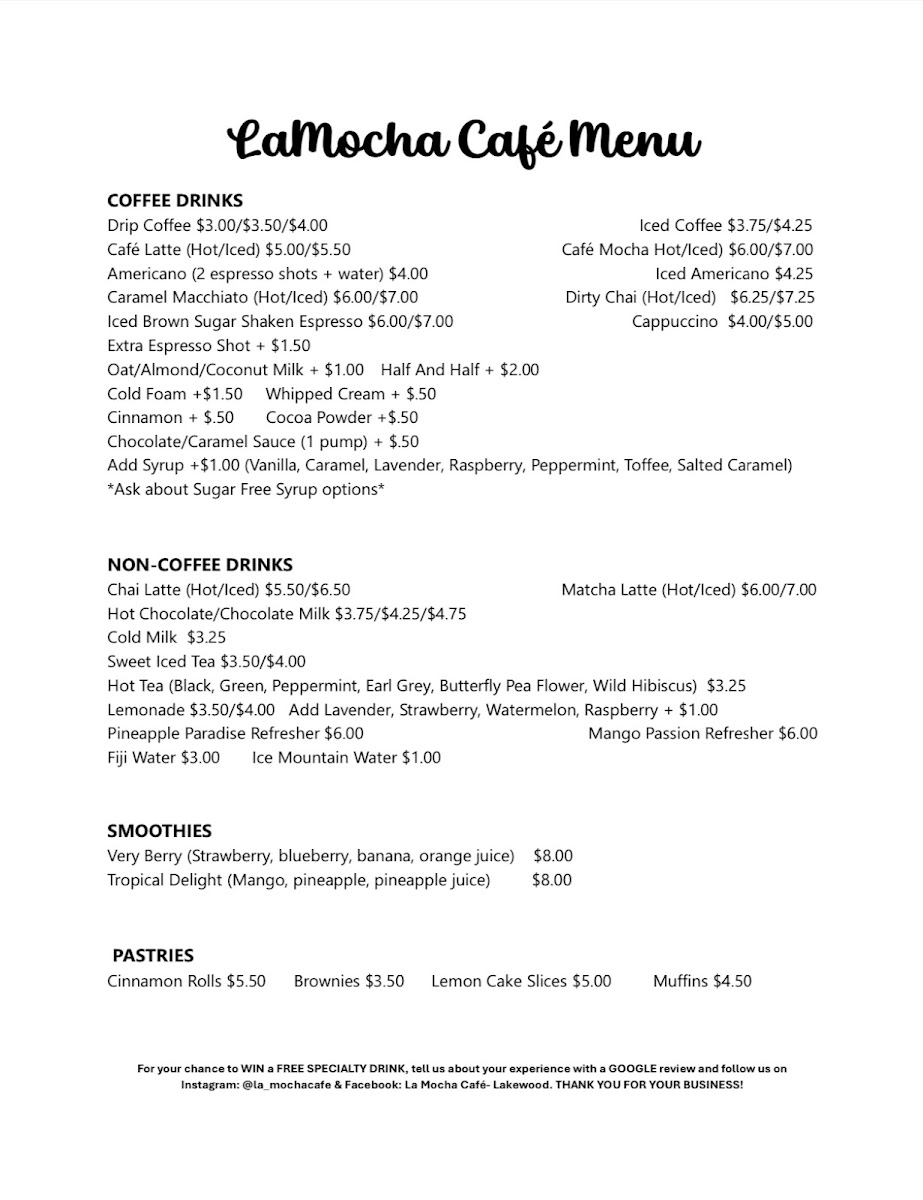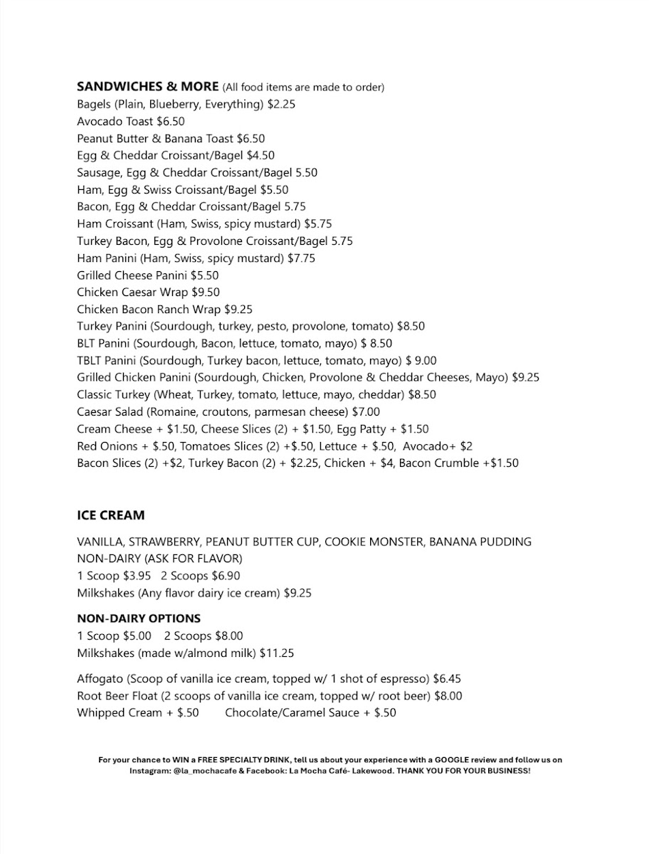 Don’t miss their fun, dessert-inspired items like Vanilla, Strawberry, Peanut Butter Cup, Cookie Monster, and Banana Pudding-perfect for those looking to end their visit on a sweet note. In short, La Mocha Cafe’s menu is a delightful blend of comfort, creativity, and quality, making it a must-visit for anyone in the Lakewood area.